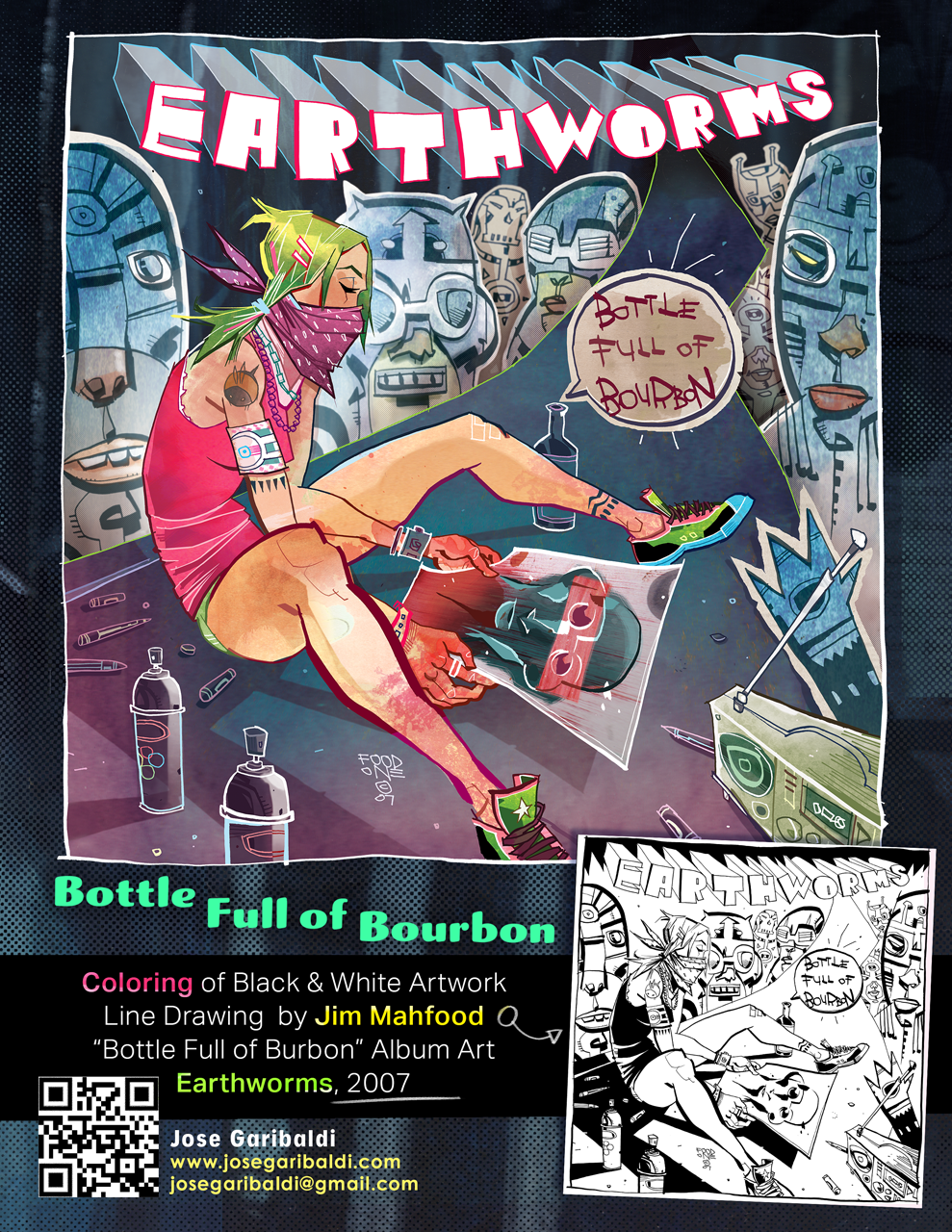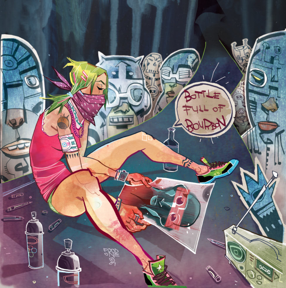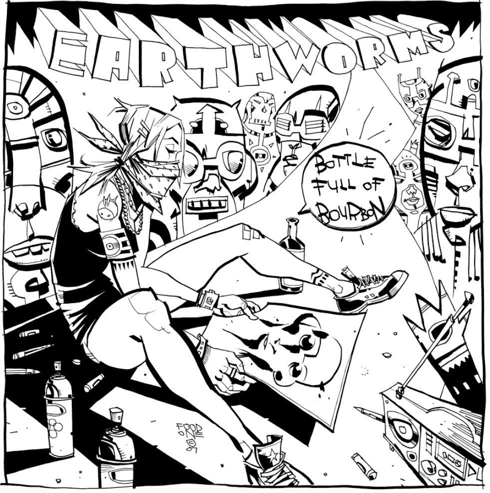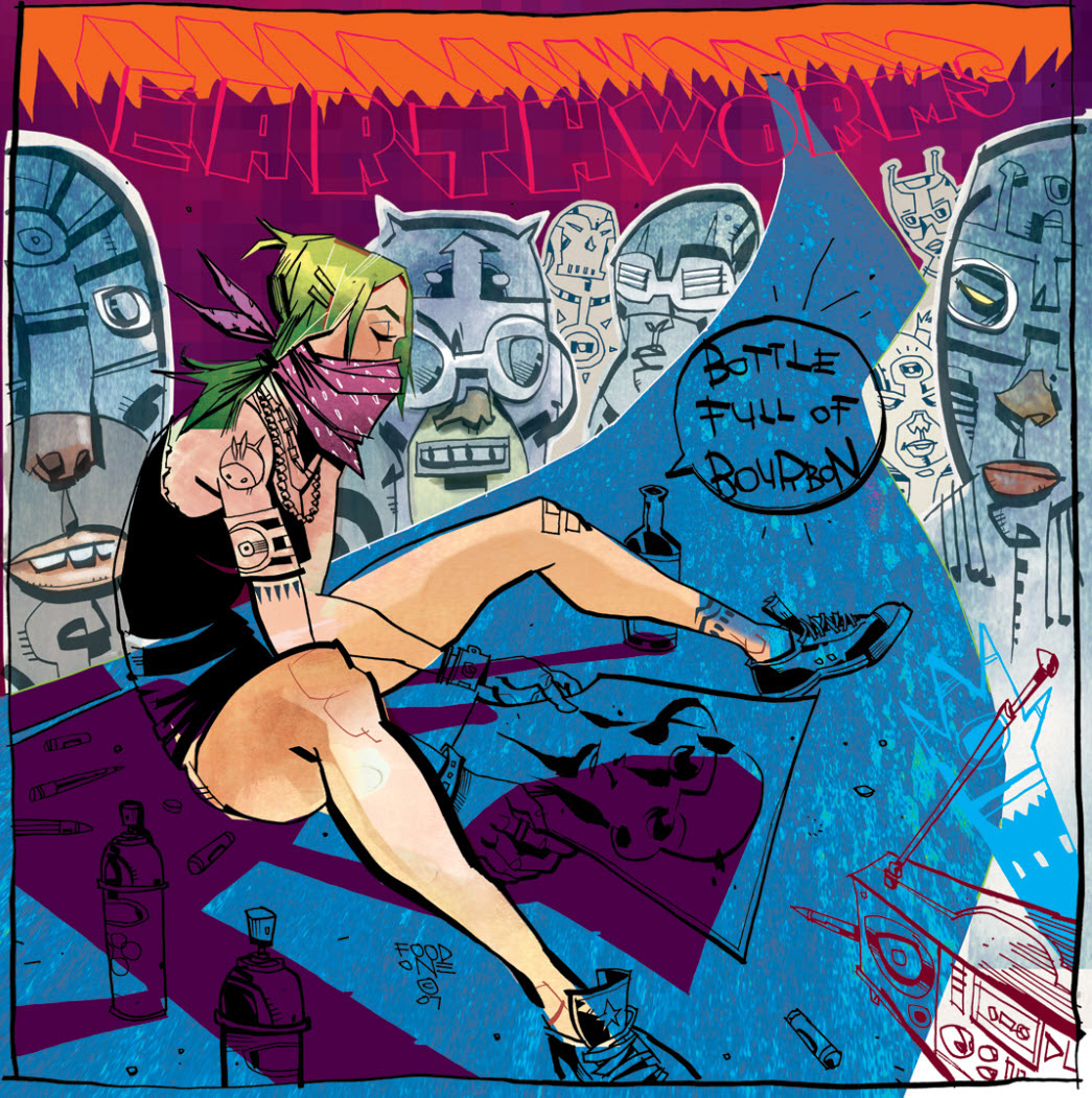 One of the greatest creators I've collaborated with, Jim Mahfood, drew the cover illustration for Earthworms' 2nd album, "Bottle Full of Bourbon", I picked it apart and added color, hand painted textures, and effects. This is a pretty old piece, 2007, but it's still a favorite and I think it still represents what I do today. That's why it's in my portfolio!π