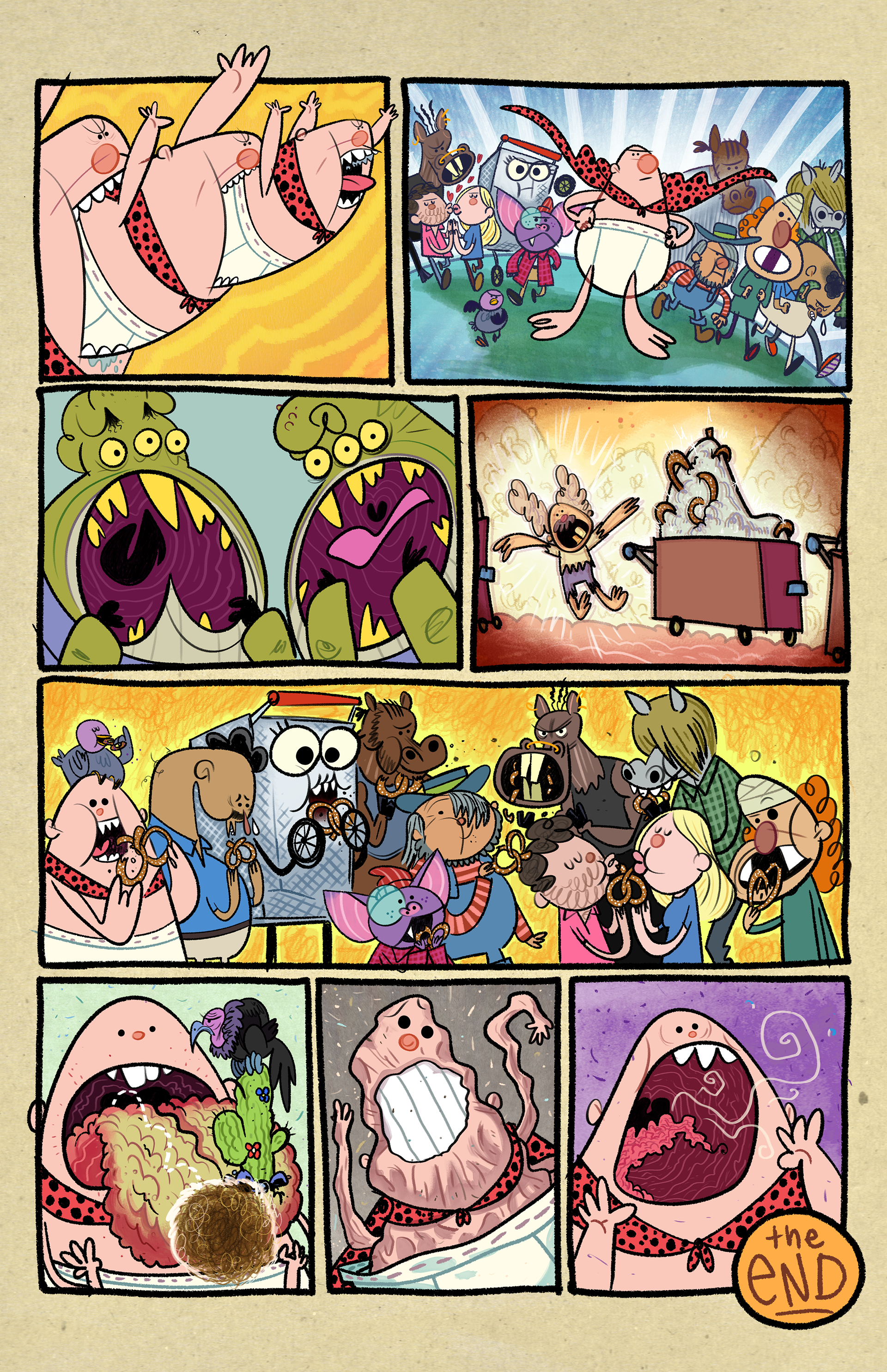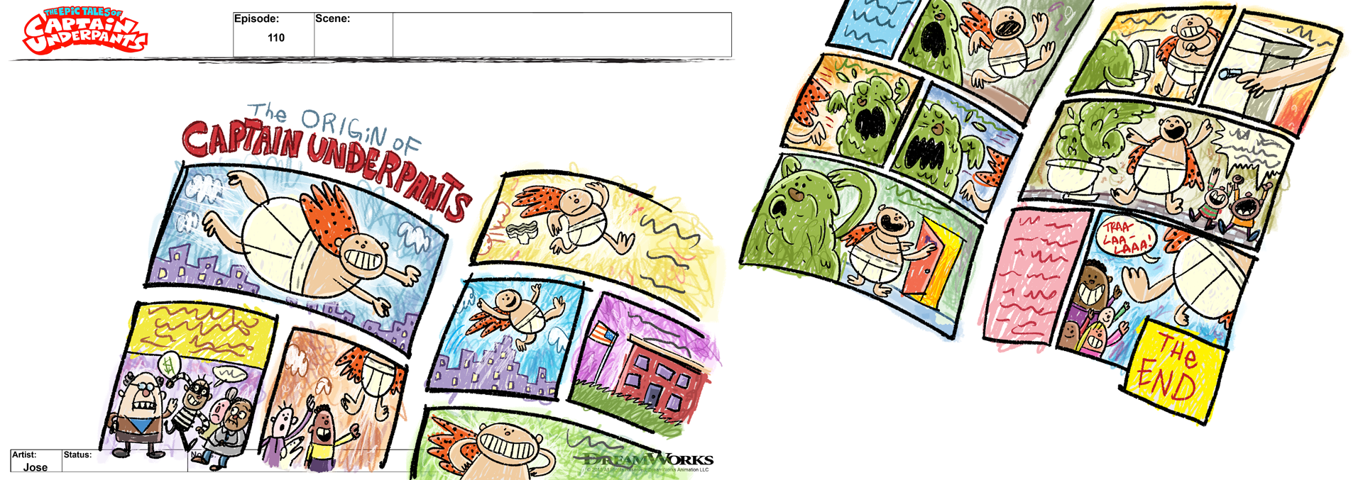 I started working on The Epic Tales of Captain Underpants in the fall of 2016. They were still figuring out the overall look of the show. I was tasked with coming up with a process for creating George & Harold's comix in a way that worked for both print AND animation. Originally some panels were to have some limited animation, but they opted for some Flip-O-Rama style frames, and even that was phased out eventually. It was a trial and error process, and it involved everyone from the storyboard artists, directors, designers, and post-production. The comics in the first few episodes were rough, but eventually they grew to be some of my favorite projects to work on.